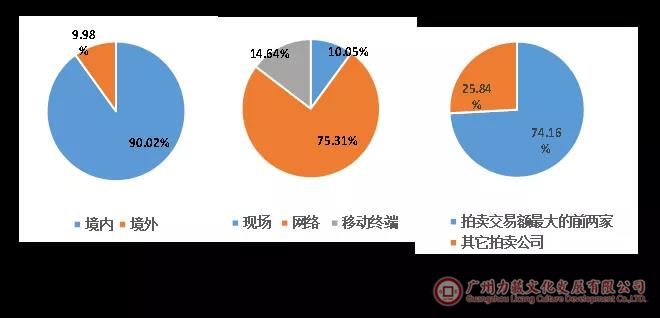 如图14所示,从交易总额看:①在境内外市场分布上,境内占比90.02%,境外占比9.98%。②在拍卖方式的分布上,网络拍卖占75.31%,移动终端拍卖占14.64%,现场拍卖占10.05%。③在拍卖机构的市场份额上,拍卖金额最大的两家机构占比74.16%。