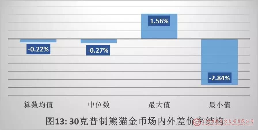 如图13所示,在上半年96个有效交易日中,30克普制熊猫金币的场内外差价率最高1.56%,最低-2.84%,算数均值-0.22%,中位数-0.27%。
