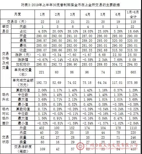 2018年9月12日30克普制熊密金币开始在上海黄金交易所(简称上金所)挂牌交易。2019年上半年30克普制熊猫金币挂牌交易的统计数据见附表3。