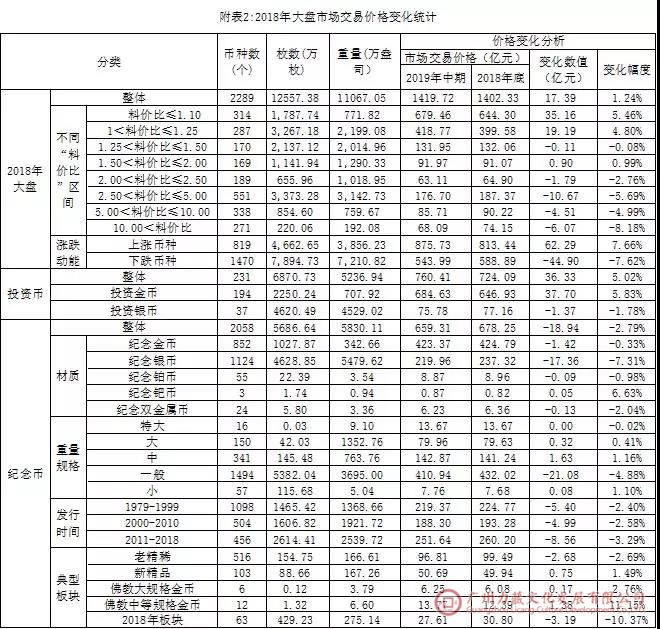 2019年发行存量是指1979年至2018年我国发行现代贵金属币的集合,也称2018年大盘。2019年中期与2018年底对比,2018年大盘变化的总体数据及内部结构数据见附表2。