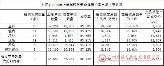 如附表4所示,根据对25家境内外拍卖机构的统计数据,2019年上半年现代贵金属币共计上拍52,224(拍卖单位),实际成交48,837(拍卖单位),成交率93.50%,成交总额折合人民币1.81亿元,拍卖单位平均成交价格3,700元。