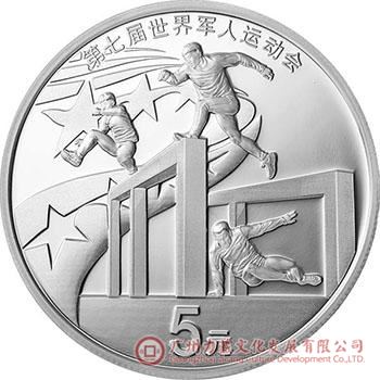 银币二:代表更强的军事五项障碍跑运动造型,需要特别科普一下,军事五项被评价为军运会上最精彩刺激也最具有看点的项目,又称陆军五项,是军体运动中最惊险、最艰苦、最具有挑战性的竞技项目,包括射击、障碍跑、障碍游泳、投射和越野跑5项比赛。而银币所表现的障碍跑,又是其中难度最大、最容易受伤,同时也最具观赏性的一环。银币表现的是运动员在同一场比赛中的不同瞬间场景组合,奔跑、跨越、落地,一个完整的障碍跑过程跨越时间和空间,被安排在币画之上。相对于第一枚银币,这枚银币更注重表现运动员身体的审美构形,不同时间点上的造型定格仿佛被一根无形的线条串联了起来,姿态的变化、动作的快慢、肌肉的松紧,表现出一种节奏感,再传递出运动激情。银币画面情绪强烈,洋溢着生动的节奏与韵律,充满生命力的形体线条有规律地运行,或大开大合、或短促激烈、或平缓飞扬,似一曲节奏明快、旋律昂扬的生命乐曲,向我们展示着这项运动的独特魅力。