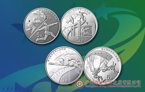 “第七届世界军人运动会”金银纪念币中有四枚15克纪念银币,它们之间形成了一个有机统一的整体。所表达的内容既丰富又独立,表现了世界军人运动会上分别代表“更快、更高、 更强、更远”的强势运动项目。