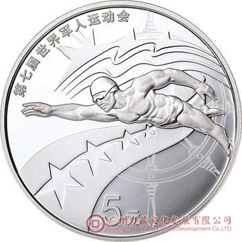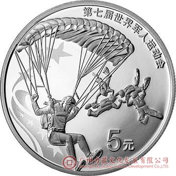 银币主题图案以现代军人运动为主题,通过表现不同运动项目的风采,以展现现代军事体育事业的蓬勃发展,图案背景为第七届世界军人运动会会徽相关图形元素组合设计,并刊“第七届世界军人运动会”字样及面额。其中主题图案的表现内容比较多,四枚银币分别描绘了代表更远的标枪、铁饼、跳高运动造型,代表更强的军事五项障碍跑运动造型,代表更快的游泳运动造型衬以船舵,以及代表更高的跳伞运动造型。四枚纪念币囊括了世界军人运动会中最具有代表性的运动项目。他们穿梭在“和平友谊纽带”(即第七届世界军人运动会会徽)里,既象征着中国“一带一路”的国际合作愿景,也生动地体现了国际军体“体育传友谊”的宗旨和本次军体会“共享友谊、同筑和平”的赛会主题。精神很抽象,但是人物造型很具象,金银币设计师们巧妙地选用了这样的组合,形成一组非常富有视觉冲击力的军体图案组合。