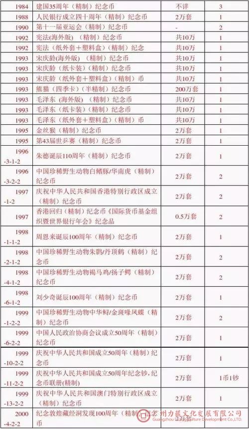 铸造数量上,由于早期精制币都是通过装帧出售,属于是纪念币中的高端品种。当纪念币呈“亿”数量级发行时,我们回头看看那些精制币的发行数量吧: