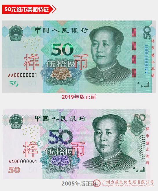 2019年版第五套人民币50元、20元、10元、1元纸币调整正面毛泽东头像、装饰团花、横号码、背面主景和正背面面额数字的样式,增加正面左侧装饰纹样,取消正面右侧凹印手感线和背面右下角局部图案,票面年号改为“2019年”。