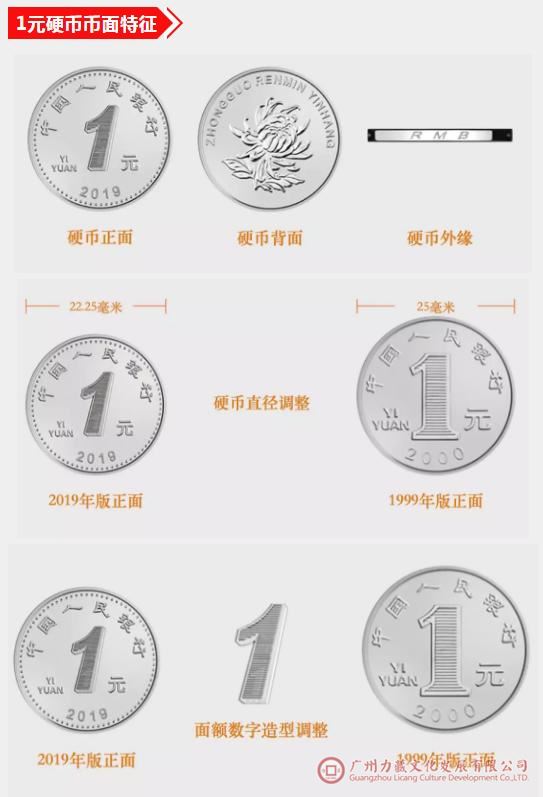 1元硬币直径由25毫米调整为22.25毫米。正面面额数字“1”轮廓线内增加隐形图文“¥”和“1”,边部增加圆点。材质保持不变。