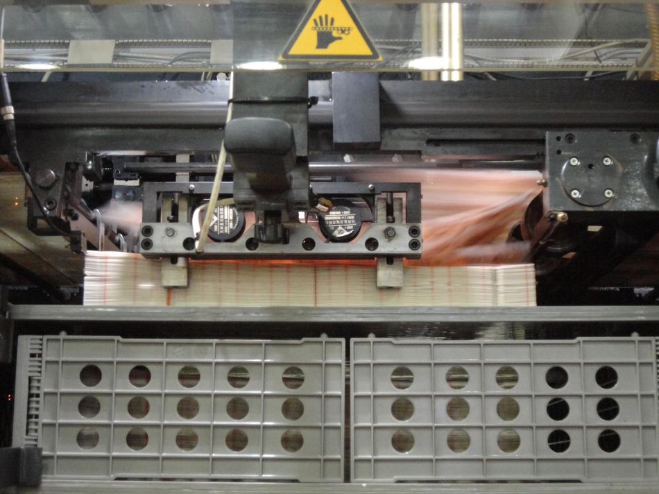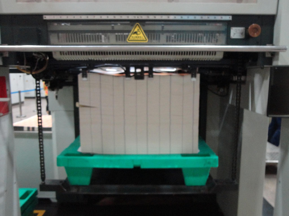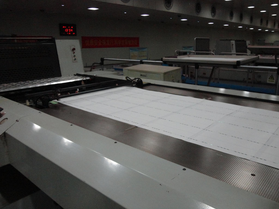 最后一道工序将大张产品裁切为规定尺寸的小张产品,对符合质量标准的成品完成分百、捆千、塑封和装箱。