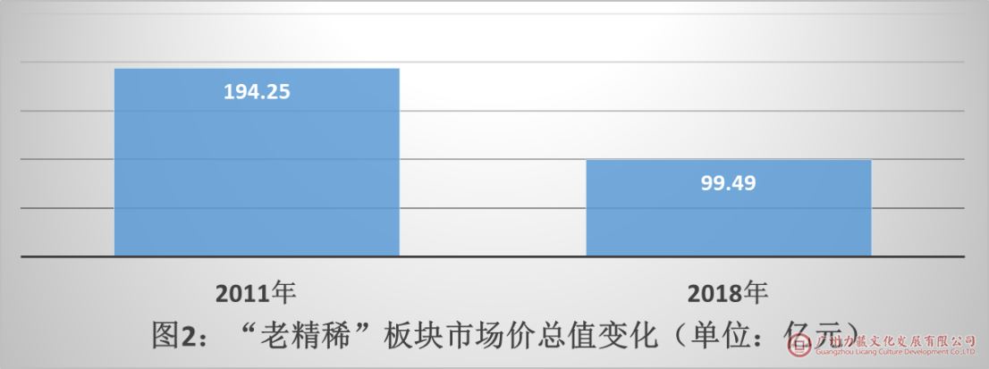 1.首先从“老精稀”板块的自身表现看(图2),这个板块的市场价总值从2011年的194.25亿元下降到2019年中期的99.49亿元,下降幅度48.78%,已有接近一半的市值蒸发。