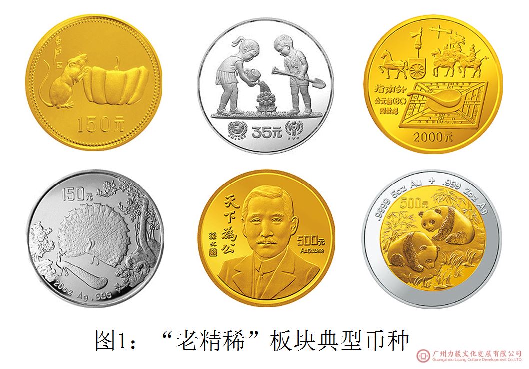 所谓“老精稀”概念由民间提出,是指在我国金币市场中发行时间在1999年之前、发行量相对较少且文化艺术价值较高的精品。市场人士对“老精稀”板块的内部结构已有不少讨论,尽管还存在一些小的意见分歧,但是总体上已经得到普遍认同。关于“老精稀”板块的界定标准,笔者在《中国现代贵金属币文化艺术价值问卷调查分析报告》第二部分第六章第五节中进行了试探性研究,可供参考。