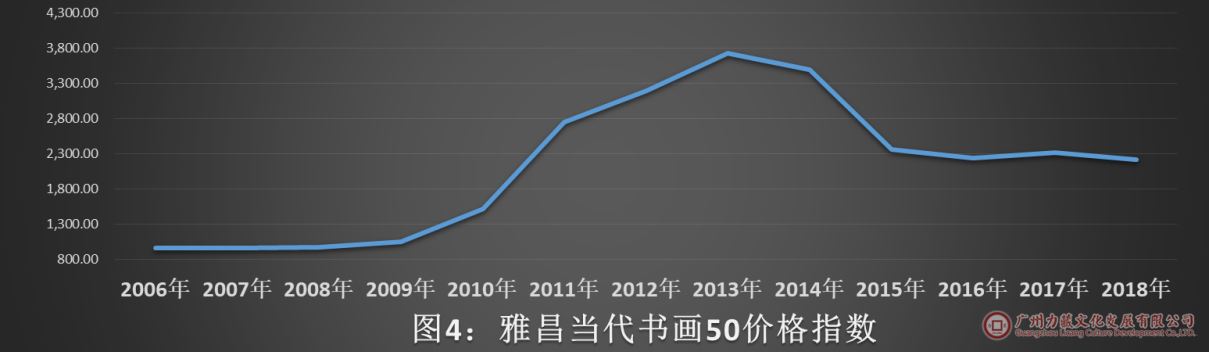 从数据方法看,笔者仅采集到雅昌当代书画50价格指数(见图4)。