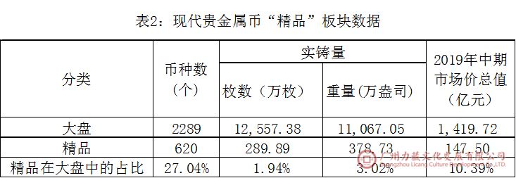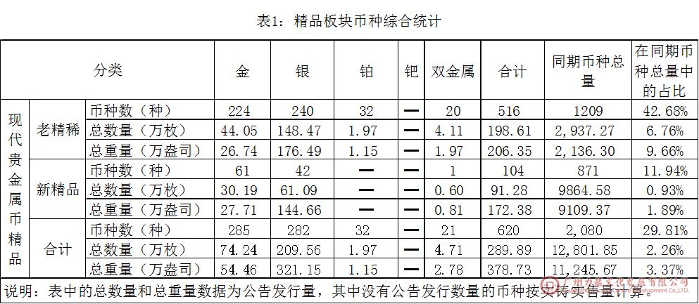 如表1所示,与现代贵金属币大盘相比,“精品”板块的币种数占29.81%,总数量占2.26%,总重量占3.37%。它们都应该是整个现代贵金属集合中的佼佼者。