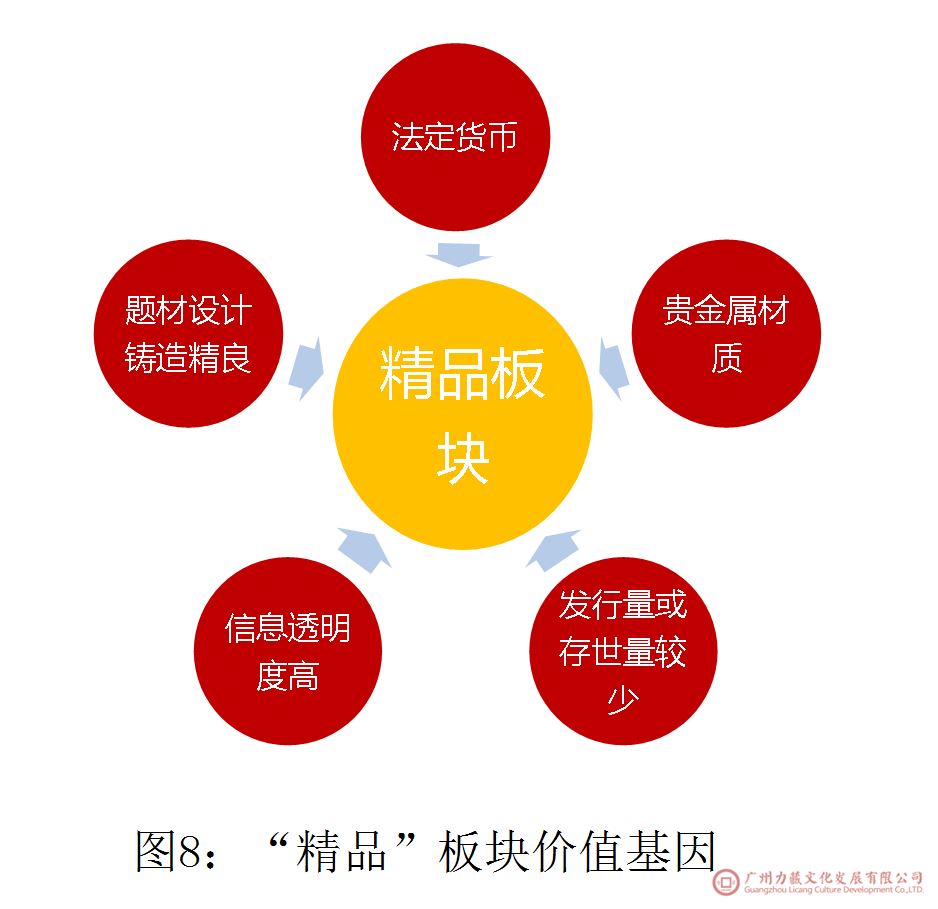 图8是“精品”板块价值基因的示意图,这些价值基因与整个现代贵金属币在某方面具有共性,同时也有自己的个性,它们可以解释为:①以法定货币形式出现,具有权威性和官方属性。②以贵金属为机体材质,具有明显的财富效应。③题材选择优秀,设计雕刻精美,具有一定的文化艺术价值。④实际铸造量相对较少,加之市场损耗,有些币种的存世量较少,具有物以稀为贵的特性。⑤币种具有官方发布的数据,信息透明度相对较高,制假贩假触犯法律。