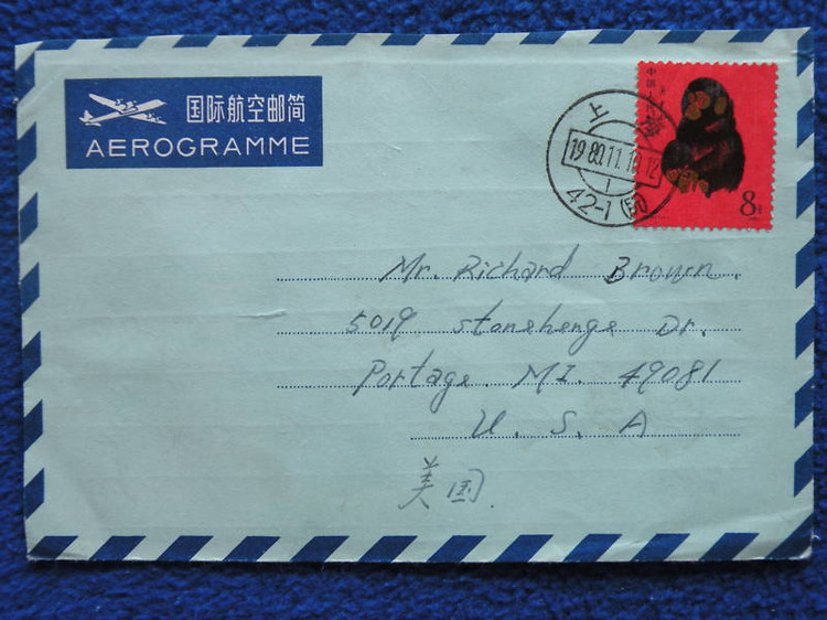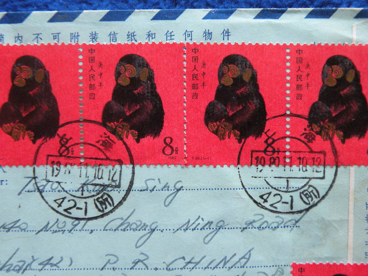 也同时收到邮友一信,希望笔者看看eBay上一个从上海寄到美国的实寄封,封上贴有7枚《T46庚申年》金猴票,不知那些金猴邮票是真还是假: