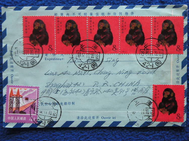 Check out this PRC postal used cover sent from Shanghai to USA on eBay, it is being offered for more than the price of mint stamps. There are a total of 7 Golden Monkey stamps on the cover, 1 on the front and 6 on the back side, very interesting, wonder if this is genuine or fake! The eBay item number is: 260712536644