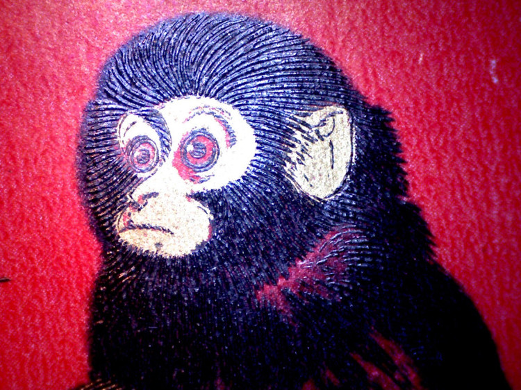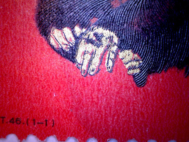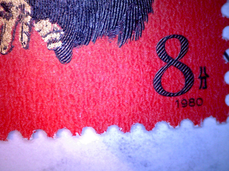 金猴原票用影雕套印,分辨主要看红色的底色是否红色和枣红色的影写版印刷,另外看猴子的黑色凸凹毛的角度、边缘状况有否零乱。对有边纸的金猴更多一些分辨方法,就是边纸的红色边缘在X30倍放大镜下呈凸凹不平整,可看到鲜红色的线条在枣红色的底色下呈45度右上向左下倾斜。