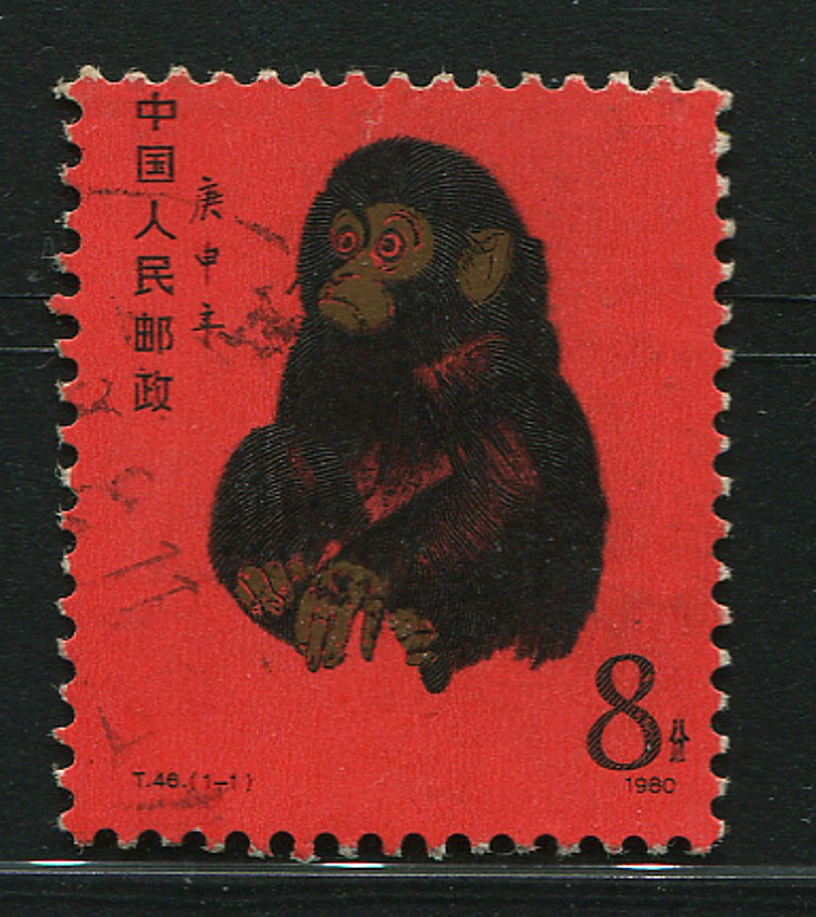 《T46庚申年》金猴票,影雕套印,齿孔P11.5,票幅26x31mm,1980.2.15.发行。