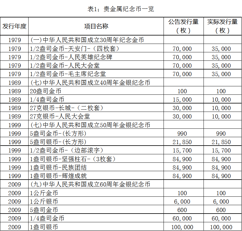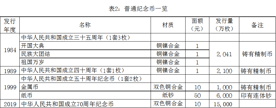 央行发行以庆祝中华人民共和国成立为主题的纪念币(以下简称“建国币”)是从1979年9月3日开始的,这也是“建国币”和新中国首套贵金属纪念币的诞生日。1979年到2019年,我国央行发行的“建国币”可以分为贵金属纪念币和普通纪念币两大类。其中在普通纪念币中又包括金属币和纸币两个子类。在1984年、1989年和1999年发行的普通纪念币金属币的每个币种中还同时铸有少量精制币。在纸币中还特别印有少量联体钞。这些“建国币”的统计汇总见表1和表2。