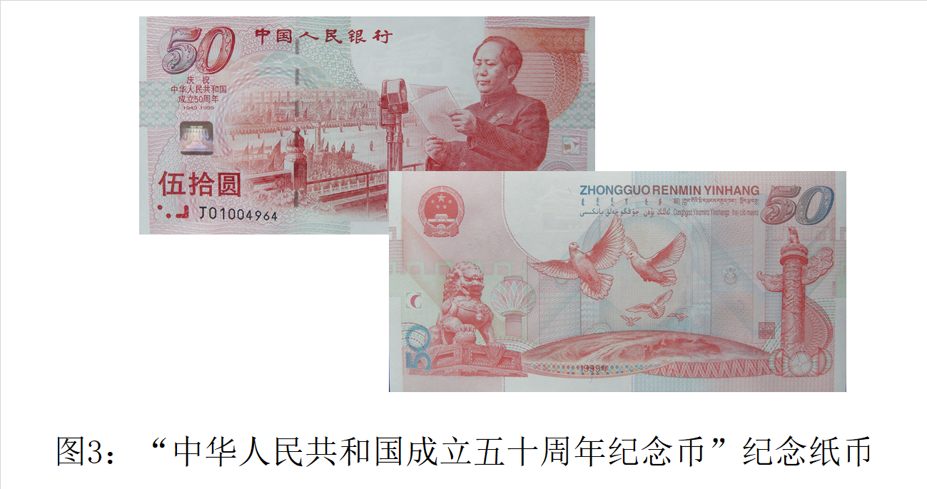 在纸币的流通中如何与伪造货币进行博弈始终是货币印制机构面临的艰巨挑战,研发各种新的防伪技术也始终是货币研究机构不懈追求的目标。值得关注的是,在“中华人民共和国成立五十周年纪念币”的50元纪念纸币中第一次使用了开窗安全线,第一次使用了带有色调的钞纸,第一次使用了全息防伪标识,第一次使用了异形号码印刷。这四个第一次填补了我国钞票生产技术的空白,提升了钞票印刷技术,标志着人民币的防伪技术和印制水平进入国际先进行列。现在回忆这段往事,可以说“中华人民共和国成立五十周年纪念币”的50元纪念纸币在我国人民币印制技术的发展历史中留下了浓墨重彩的一笔。