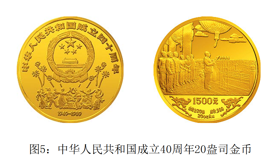 1989年央行发行了“中华人民共和国成立40周年金银纪念币”一套6枚,其中有1枚20盎司金币。