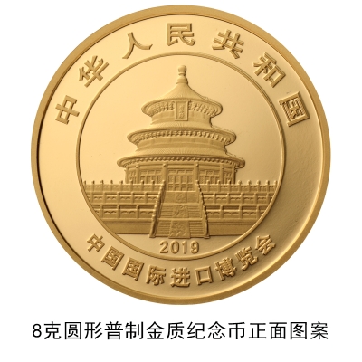 8克圆形金质纪念币背面图案为母子熊猫图,并刊“8g Au.999”字样、“中国国际进口博览会”英文字样及面额。