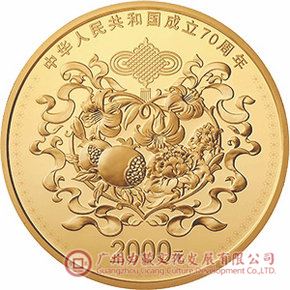 中华人民共和国成立70周年纪念金银币:共发行2金4银6枚,其中,150克金币的发行量2000枚、8克金币的发行量6000枚、1/4盎司金币的发行量60000枚、1枚1公斤银币的发行量为5000枚、150克银币的发行量7000枚、2枚30克银币的发行量则为100000枚。