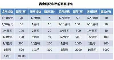 《中华人民共和国人民币管理条例》的颁布促进了中国现代贵金属纪念币的进一步规范。从2001年起,中国现代贵金属纪念币开始实行新的面额标准。1盎司金币面额基准为500元人民币,1盎司银币面额为10元,其他规格按照比例增减,具体见下表。