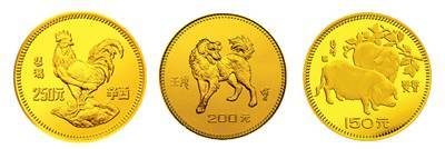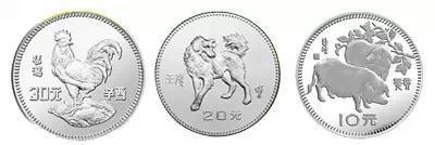 ● 同一系列、同一规格的纪念币在不同年份标注不同的面额。如1981年发行的8克鸡年金币标注250元,15克银币标注30元;而1982年发行的8克狗年金币标注200元,15克银币标注20元;1983年发行的8克猪年金币标注150元,15克银币标注10元。