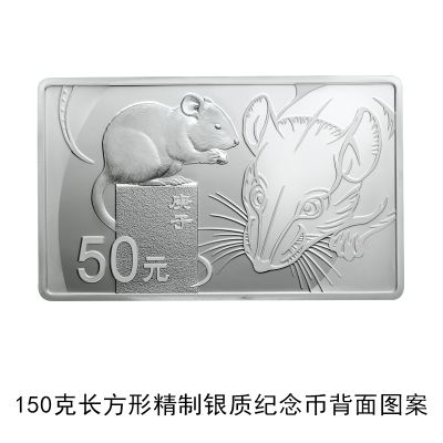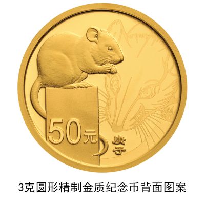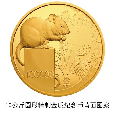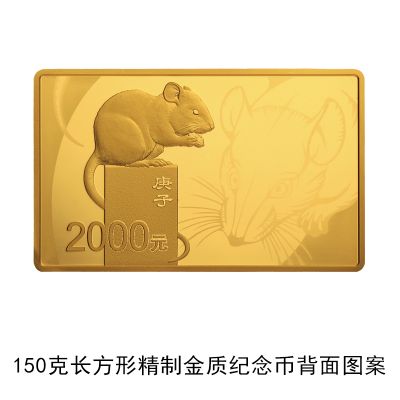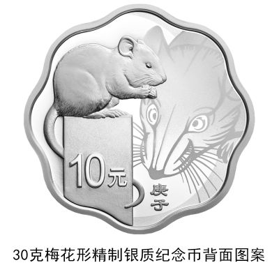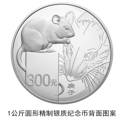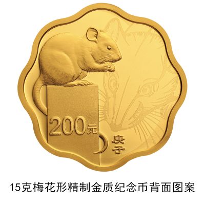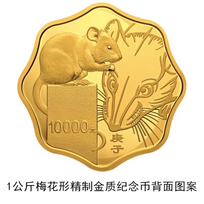 3克圆形金质纪念币、10克扇形金质纪念币、15克梅花形金质纪念币、150克长方形金质纪念币、500克圆形金质纪念币、1公斤梅花形金质纪念币、2公斤圆形金质纪念币、10公斤圆形金质纪念币、30克圆形银质纪念币、30克梅花形银质纪念币、30克扇形银质纪念币、150克长方形银质纪念币、1公斤圆形银质纪念币等13枚金银纪念币背面图案均为写实鼠造型,衬以装饰鼠纹样,并刊面额及“庚子”字样。