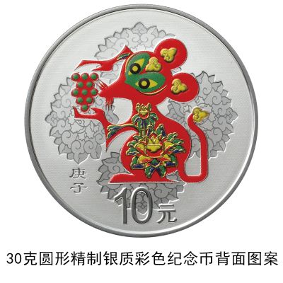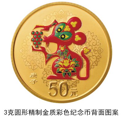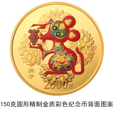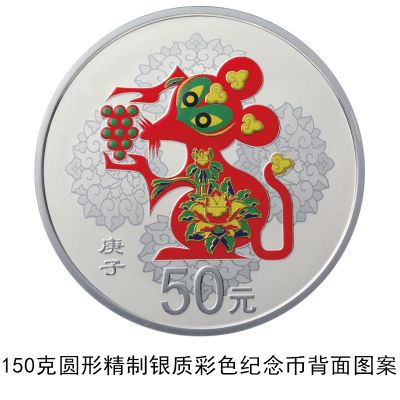 3克圆形金质彩色纪念币、150克圆形金质彩色纪念币、30克圆形银质彩色纪念币、150克圆形银质彩色纪念币等4枚金银纪念币背面图案均为中国民间传统装饰鼠造型,衬以吉祥纹饰(局部彩色),并刊面额及“庚子”字样。