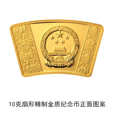(五)10克扇形金质纪念币为精制币,含纯金10克,外圆半径51毫米,内圆半径36毫米,圆心角30度,面额150元,成色99.9%,最大发行量10000枚。