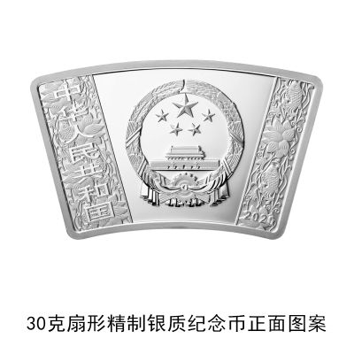 (六)30克扇形银质纪念币为精制币,含纯银30克,外圆半径85毫米,内圆半径60毫米,圆心角30度,面额10元,成色99.9%,最大发行量60000枚。