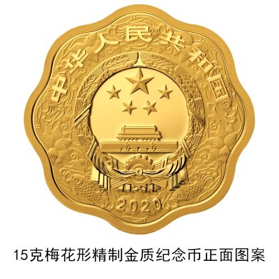 (七)15克梅花形金质纪念币为精制币,含纯金15克,外接圆直径27毫米,面额200元,成色99.9%,最大发行量8000枚。