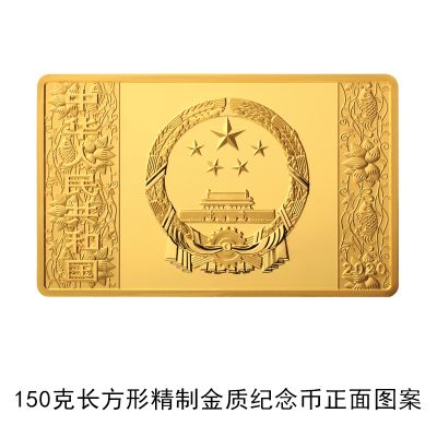 (九)150克长方形金质纪念币为精制币,含纯金150克,规格64毫米×40毫米,面额2000元,成色99.9%,最大发行量1000枚。