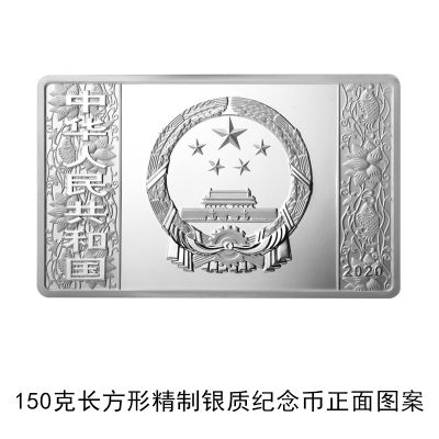 (十)150克长方形银质纪念币为精制币,含纯银150克,规格80毫米×50毫米,面额50元,成色99.9%,最大发行量10000枚。