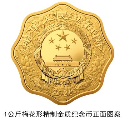 (十四)1公斤梅花形金质纪念币为精制币,含纯金1公斤,外接圆直径100毫米,面额10000元,成色99.9%,最大发行量118枚。