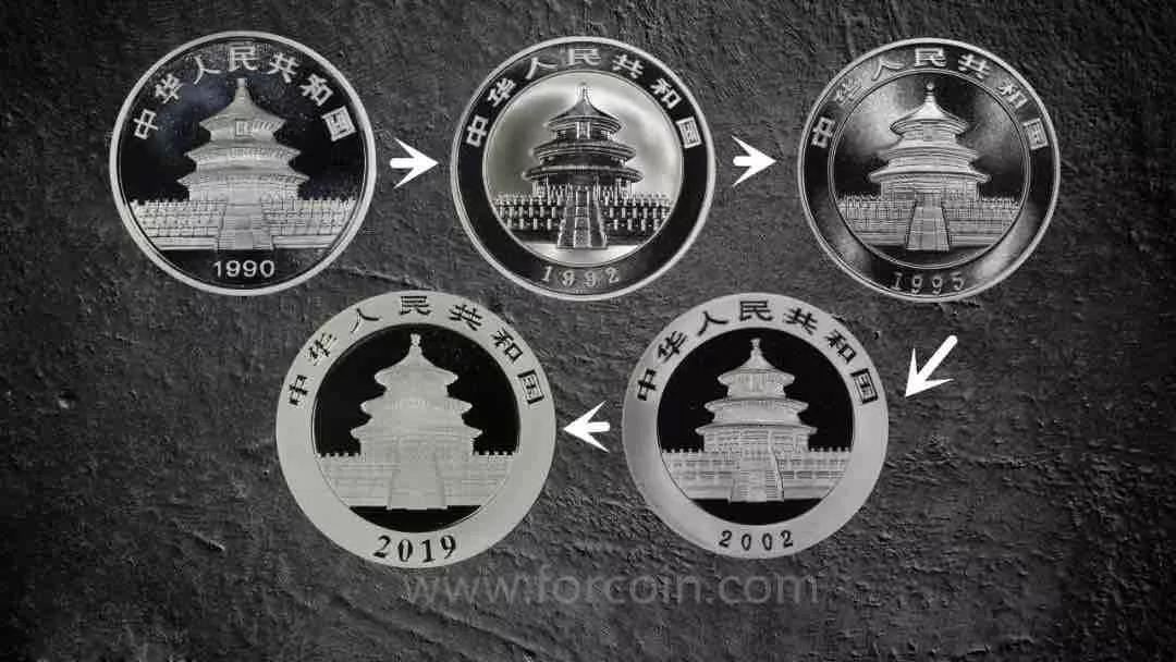 熊猫币的天坛祈年殿图案,最初由上海造币厂的孙奇龄先生设计雕刻,后来沈阳造币厂的申宪章在浮雕细节上又进行改动,在90年代又历经几次变化,将90年代和2002年后的天坛用放大镜对比,能看出明显的手工雕刻演化至机器雕刻的过程。