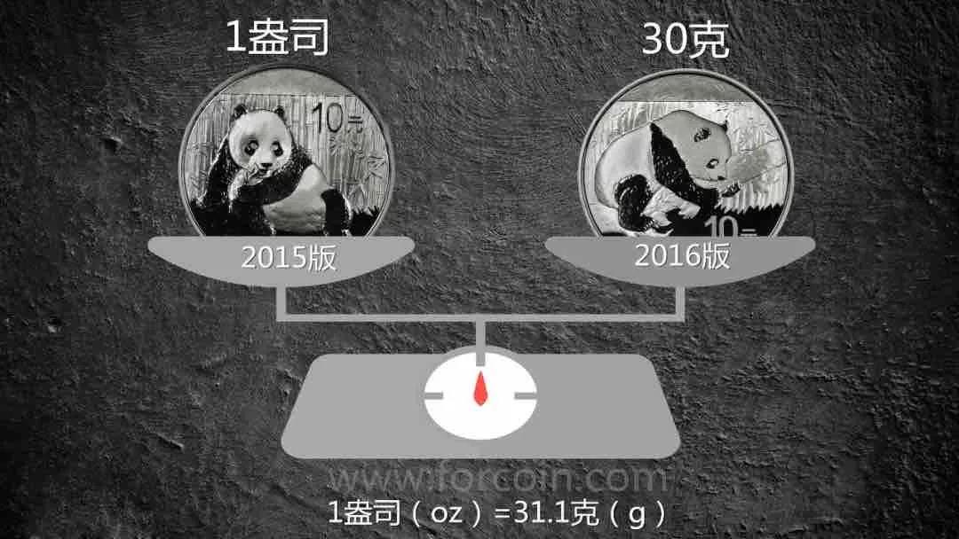 普制熊猫银币以1盎司为标准重量,并在币面上进行标识,唯一的例外是2015版,上面没有标识任何重量和材质信息。从2016版开始,普制熊猫银币启用了“盎司改克”后的新标准,以30克作为标准重量,直径保持40毫米不变。