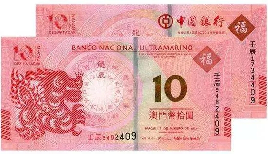 澳门生肖钞,每套2张,因此也叫生肖对钞,从2012年起开始发行,分别由中国银行和大西洋银行发行。