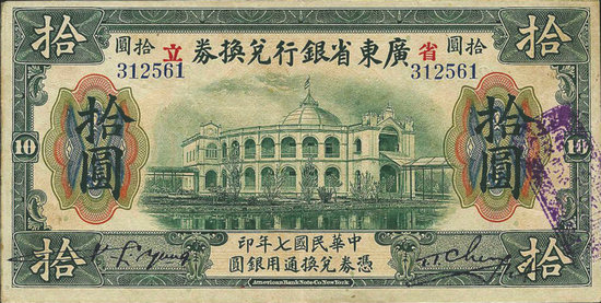 民国七年(1918),由美国钞票公司印制,广东省银行发行的纵87、横170毫米之拾圆兑换券(图1)上,就有辛亥革命时期武昌起义纪念建筑图景,即广州咨议局大楼。广东咨议局位于中山三路广州起义烈士陵园内,建于宣统元年(1909),由日本留学生金浦崇、金浦芬捐建。为一组中西合璧的建筑群,坐北朝南,主楼仿西方古罗马式的议会大楼形式。1911年广州爆发“三·二九”起义失败,牺牲的革命党人陈尸在咨议局前,后由革命党人潘达微殓葬于黄花岗。后来以“咨议局前新鬼录,黄花岗上党人碑”为题写了一篇报道。1911年武昌起义后,广东各界在咨议局集会,庄严宣布广东脱离清政府独立,成立都督府,推选革命党人胡汉民为都督。此后咨议局先后改为省议会和非常国会。1921年5月,孙中山在此宣誓就任非常大总统。