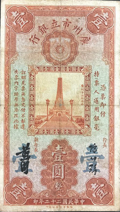图3 1933年广州市立银行 发行的壹圆银毫券