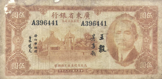 而广东省银行于民国二十九年(1940)发行的伍圆券(图4)上,则有辛亥革命纪念建筑——广州黄花岗七十二烈士陵园的正面图景。该券纵75、横150毫米,由新华雕刻公司印制。黄花岗原名红花岗,潘达微在安葬了烈士后,认为“红花”不及“黄花”一词雄浑优美,因此在介绍烈士安葬情况的报道上,把红花岗易名为黄花岗。从此改名沿用至今。1911年4月,黄兴率120余名敢死队员直扑两广总督署,发动了同盟会的第十次武装起义即广州起义,攻打两广总督。经一昼夜血战,终因寡不敌众而失败,喻培伦等100余人牺牲。同盟会员潘达微冒险奔走四方,由慈善机构出面收殓遗体,共得72具,合葬于此。1912年,广州军政府拨款10万元在原墓地建烈士陵园,孙中山亲自栽植了青松,并为墓园手书“浩然正气”四字。以后墓园还多次扩建。其占地面积16万平方米,建筑规模宏大,园内300多米长的层级主干道两旁苍松翠柏排列有序。巍峨的正门为高13米的牌坊,上面镌刻着孙中山亲笔题词“浩气长存”四字。园内有墓亭、陵墓、纪功坊、记功碑等。记功碑上刻有历史缘由和烈士英名,顶部是高举火炬的石雕自由神像。