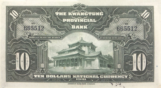 民国二十年(1931),由美国钞票公司印制,广东省银行发行的纵82、横150毫米之拾圆大洋券(图2)上,则有纪念辛亥革命元勋孙中山的建筑图景,即广州中山纪念堂。1921年,孙中山在此担任非常大总统,次年此地被陈炯明的大炮轰毁。孙中山逝世后的第二年即1926年,当时的广东国民政府为纪念他的功绩,在广州兴建了中山纪念堂。其址于越秀山南麓的总统府旧址,设计者为我国著名的设计师吕彦直。它的主体建筑是座八角开宫殿式建筑,建筑面积1.2万平方米。堂顶为八角形,铺宝蓝色琉璃瓦,分高低四层。大堂正面,悬挂着孙中山手写的金字牌匾“天下为公”;大堂四周的基座和阶梯都是花岗石,既庄重又典雅。整个建筑来富有浓厚的民族风格和中国传统建筑之艺术特色,不愧是中国传统建筑的经典之作。
