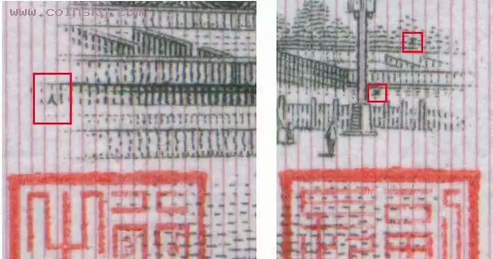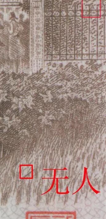 1.胶版背棕:兰字二三罗马,红二罗胶,红三罗胶四种在正面图案中大门右侧五与六栏杆上有英文字母"J",六与第七报栏杆之间的上端有一英文字母“A”,"A"下是一个小"+"(注意,是小的"+"), 左边第二个人手腕上有“中”字暗记。