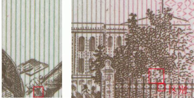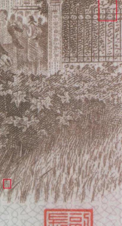 拾元暗记:背面有“工、人”二字暗记,分别藏于天安门右侧华灯柱子之右和天安门左端边缘处,天安门右侧华灯柱子右上还有“Z”字母暗记。