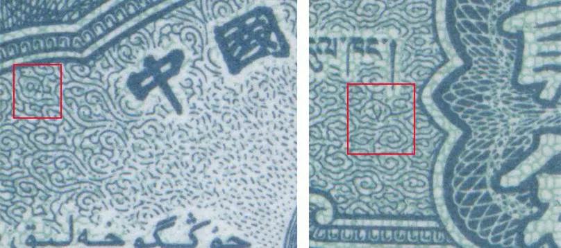 1.背面右侧藏文下有党徽,背面中国人民银行行名“中”字左边有斜倒的“古”字。