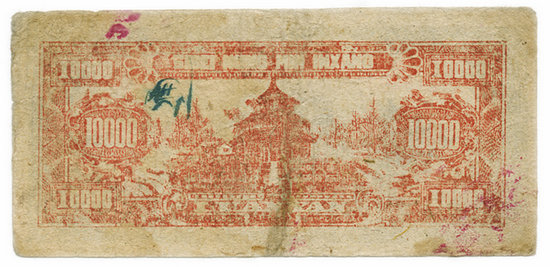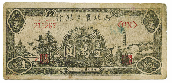 西北农民银行壹萬圆纸币:币长12.6、宽6厘米,双面印刷,横印,正面墨蓝彩,背面橙红彩。正面(图1)四周花框,正中花框内印币值白文“壹萬圆”三字;上边花框内正中印阳文瘦金体“西北农民银行”六个字;币面左边印树林、房舍,右边印宝塔山;四角花框内各印白文“壹萬”二字;下边花框正中横白框内印阳文“中华民国三十七年”八个字。币值右下边钤红文方印“经理之章”,左下边钤红文方印“副经理章”。“西北农民银行”右下方印红文括号及CX两个英文字母;左下方印红文“218263”六个阿拉伯数码,是该币的编号。背面(图2)四周花框,正中印天坛,其左右花框内印白文“10000”五个阿拉伯数码;四角花框内各印白文“10000”五个阿拉伯数码。上边花框上印白文英文字母,即西北农民银行。下边框上压印白文英文字母,即天坛。