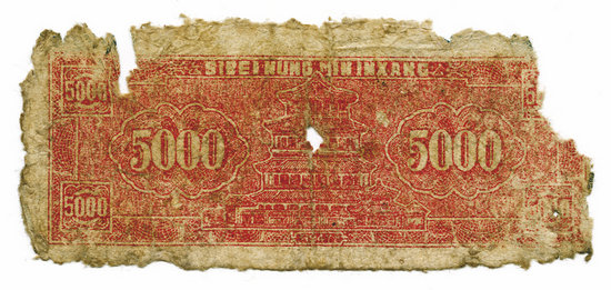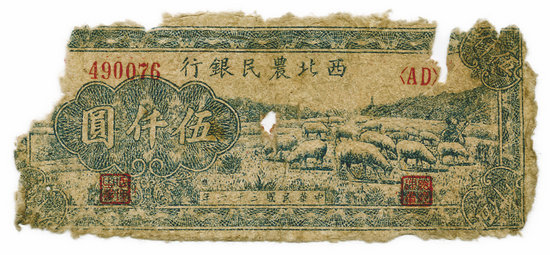 西北农民银行伍仟圆纸币(有残):币长14、宽6厘米,双面印刷,横印。正面深蓝彩,背面红彩。正面(图3)四周花框,中间左边花框内印白文币值“伍仟圆”三字;右边是牧羊人和羊群图案。上边花框正中是阳文瘦金体“西北农民银行”六个字。其右边印红彩括号及AD两个英文字母;其左边印红文“490076”六个阿拉伯说码。下边花框内,正中白长条框内印阳文“中华民国三十六年”八个字;其右边钤红文方印“总经理章”;其左边钤红文方印“协理之章”。四角花框内各印白文“伍仟”二字。背面(图4)四周花框,上边花框上印白文英文“西北农民银行”。正中印宝塔图案,其左右花框内各印白文“5000”四个阿拉伯数码;四角花框内各印白文“5000”四个阿拉伯数码。这张纸币是1947年在解放区发行的。
