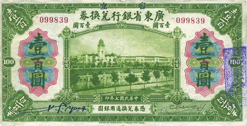 作为辛亥革命的重要纪念地,民国纸币上除有广州咨议局大楼、中山纪念堂、中山纪念碑、黄花岗七十二烈士陵园这些以外,带广州图景的还有另外五种。其一,为民国七年(1918)广东省银行发行的壹百圆银元兑换券。此券纵96、横186毫米,由美国钞票公司印制,正面图景为广州广东高级师范学堂(图1)。学校位于文明路215号的钟楼礼堂,面积300多平方米。它溯源于1905年两广速成师范馆之创立,旋后改为两广师范学堂,1908年改为两广优级师范学堂。1912年改为广东高等师范学校,嗣归国立。1924年1月2日,孙中山在国立广东高等师范学校大礼堂举行改组的中国国民党第一次全国代表大会,就是国共合作的大革命时代。会后决定在这里办广东大学。那时孙中山由2月起,每周在高师大礼堂演讲新的革命的三民主义,并指示联俄、联共、扶植农工三大政策的重要。孙中山逝世后,其更名为中山大学。