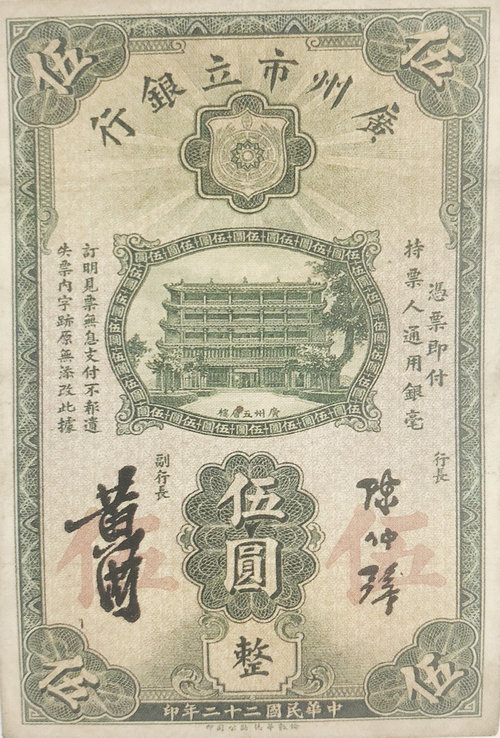 其四,为民国二十二年(1933)广州市立银行发行的伍圆银毫券。该券纵148、横90毫米,由伦敦华德路公司印制,正面图景为广州镇海楼(图4)。其又名望海楼,还因楼高5层而俗称“五层楼”。它位于广州越秀山小蟠龙冈上,为广州市标志性建筑之一。全楼高25米,呈长方形,阔31、深16米。下面两层围墙用红砂岩条石砌造,三层以上为砖墙,外墙逐层收减,有复檐5层,绿琉璃瓦覆盖,饰有石湾彩釉鳌鱼花脊,朱红墙绿瓦砌成,巍峨壮观,被誉为“岭南第一胜览”。楼前碑廊有历代碑刻,右侧陈列有12门古炮。明洪武十三年(1380),永嘉侯朱亮祖扩建广州城时,把北城墙扩展到越秀山上,同时在山上修筑此楼以壮观瞻。此楼历史上曾五毁五建,现为1928年重修时由木构架改建成的钢筋混凝土结构。1929年成为广州市市立博物馆。1950年改名广州博物馆。